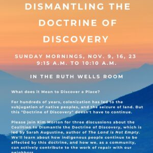 Dismantling the Doctrine of Discovery What does it Mean to Discover a Place? For hundreds of ... 09 Nov 9:15 am - 10:10 am Ruth Wells RoomRiverside Community Church